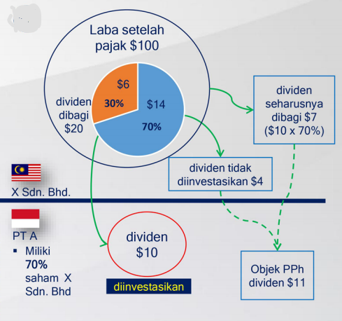 PT A sebagai Wajib Pajak Dalam Negeri memiliki 70% saham X Sdn. Bhd yang berkedudukan di Malaysia. X Sdn. Bhd merupakan perusahaan tidak terdaftar di bursa efek Malaysia, atau badan usaha non bursa. Pada Tahun 2021, X Sdn. Bhd memiliki Laba Setelah Pajak sebesar $100 dan dividen yang dibagikan hanya $20. Dikarenakan PT A memiliki kepemilikan saham 70% maka PT A berhak atas dividen sebesar $14 (70% x $20).