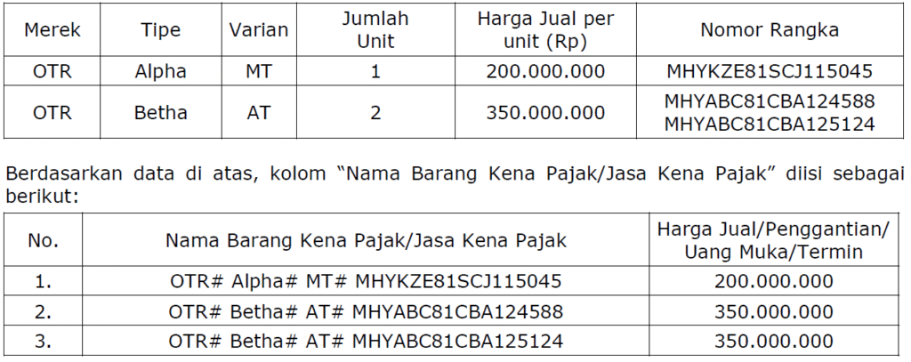 Dalam lampiran bagian C PER-03/2022 menjelaskan bahwa bila PKP melakukan penyerahan BKP berupa kendaraan bermotor baru kepada Pembeli BKP untuk dilakukan registrasi kendaraan bermotor baru, kolom BKP dalam Faktur Pajak wajib diisi dengan keterangan yang paling sedikit memuat informasi berupa merek, tipe, varian, dan nomor rangka, dengan format: #merek#tipe#varian#nomor rangka. Untuk lebih jelasnya, perhatikan contoh 3 di bawah ini.