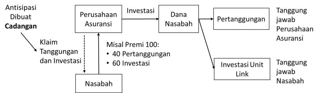Gambar 1 diatas menjelaskan bahwa premi yang dibayar oleh nasabah (misalnya Rp.100) akan dialokasikan sebagian untuk pertanggungan risiko, misalnya asuransi jiwa, dan sebagian untuk investasi, seperti investasi di saham (misal; Rp.40 untuk pertanggungan dan Rp.60 untuk investasi). Dana yang diterima oleh Perusahaan Asuransi akan diinvestasikan pada instrument investasi yang sesuai dengan peraturan. Risiko dan hasil dari investasi dari pertanggungan merupakan tanggungan perusahaan asuransi. Risiko dan hasil investasi unit link merupakan tanggungan nasabah. Untuk antisipasi klaim yang akan dilakukan oleh nasabah, baik atas pertanggungan risiko maupn dari investasi unit link, maka perusahaan asuransi membuat pencadangan. Semua cadangan diperlakukan sebagai pengurang penghasilan kena pajak. Di sisi lain, penghasilan dari kedua kelompok investasi ini dibedakan. Hasil investasi dari pertanggungan diakui sebagai objek pajak bagi perusahaan asuransi, dan penghasilan dari investasi unit link tidak diakui sebagai objek pajak bagi perusahaan asuransi.