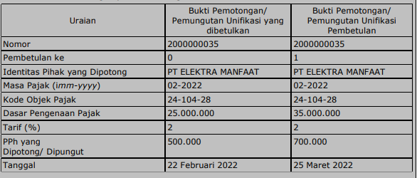 Setelah menyampaikan SPT Masa PPh Unifikasi Masa Pajak Februari 2022, pada tanggal 25 Maret 2022 PT BANGUN PERSADA JAYA menerima koreksi tagihan atas jasa instalasi/pemasangan unit AC dari PT ELEKTRA MANFAAT yang semula tertulis sebesar Rp25.000.000,00 tetapi seharusnya sebesar Rp35.000.000,00. Sesuai ketentuan Pasal 10 ayat (1), PT BANGUN PERSADA JAYA terlebih dahulu harus membuat Bukti Pemotongan/Pemungutan Unifikasi Pembetulan atas Bukti Pemotongan/Pemungutan Unifikasi nomor 2000000035 dengan perincian sebagai berikut: