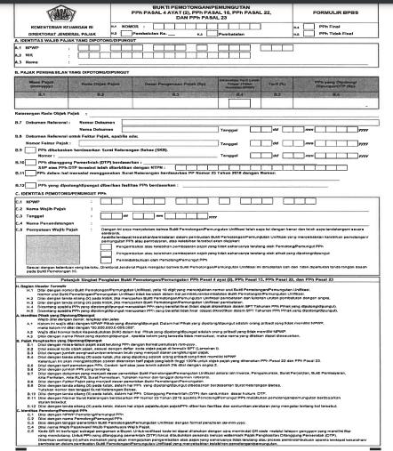 Bukti Pemotongan/Pemungutan Unifikasi dibedakan berdasarkan lawan transaksinya bila Wajib Pajak dalam negeri dikumpulkan pada Formulir BPBS, sedangkan bila Wajib Pajak Luar negeri digabungkan dalam Formulir BPNR.