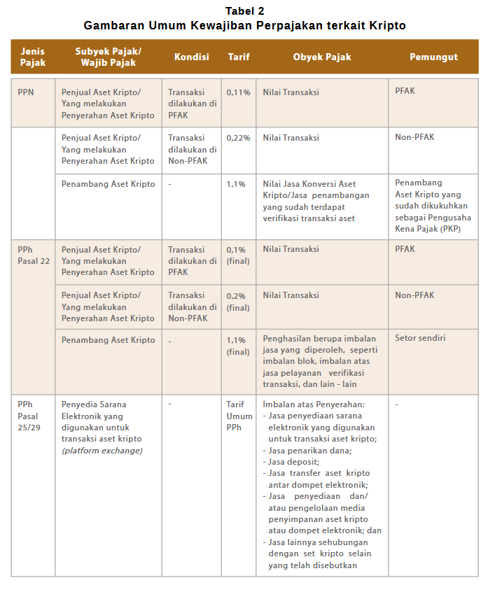 atau disebut pedagang fisik aset kripto (PFAK). Diatur dalam PMK 68/2022, objek pajak perdagangan kripto diatur menjadi beberapa jenis sebagaimana disajikan pada tabel 2 dibawah ini.