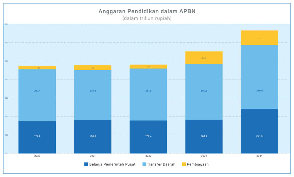Perlu diketahui bahwa pada APBN 2024, Pemerintah memberikan alokasi sebesar 665 triliun rupiah untuk dana Pendidikan (Kemenkeu, 2024). Anggaran untuk dana Pendidikan tersebut terdiri dari Rp241,5 triliun anggaran pendidikan