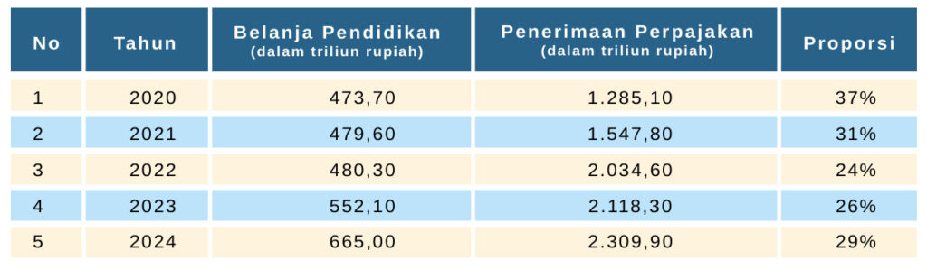 Penelitian lain yang dilakukan oleh SMERU Institute dan ADB juga menemukan bahwa kualitas Pendidikan di Indonesia sangat bervariasi antar wilayah. Lebih lanjut, penelitian tersebut juga mengungkap bahwa kualitas Pendidikan yang rendah di satu wilayah di Indonesia cenderung disebabkan karena kesulitan dan tantangan yang dihadapi oleh siswa dalam mengejar wajib belajar Sembilan tahun. Padahal, apabila melihat anggaran belanja dibandingkan dengan penerimaan perpajakan, kita dapat mengetahui bahwa secara rata – rata pada tahun 2020 sampai dengan 2024 lebih dari 29% penerimaan perpajakan yang dikumpulkan dari Wajib Pajak digunakan untuk belanja Pendidikan (The SMERU Research Institute, 2015). Adapun detil perbandingan dapat dilihat pada table dibawah ini sebagai berikut.