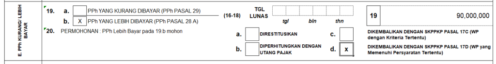 Tuan Laddhu Sign merupakan Pakar hukum yang memberikan berbagai jenis jasa dan bantuan hukum. Tuan Laddhu Sign menyampaikan SPT PPh OP Tahunan untuk Tahun Pajak 2021 berstatus Lebih Bayar sebesar Rp90.000.000,00. Atas Lebih Bayar tersebut, SPT Induk PPh Tahunan angka 20 tercentang kolom d sesuai gambar di bawah ini.